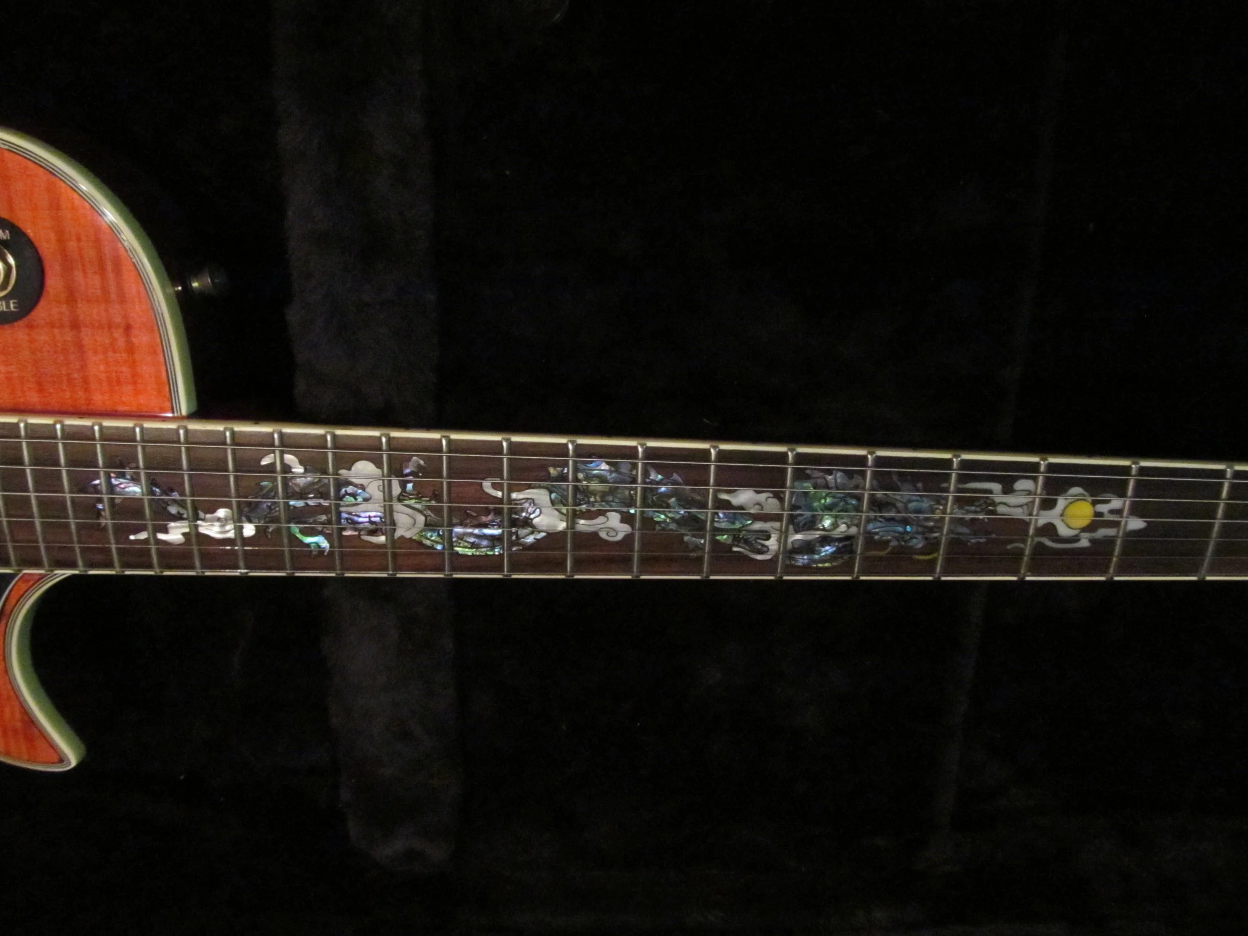 Backstory: I walked into the now defunct Absolute Music on Upper James and immediately saw this thing staring at me; a Les Paul body finished in an orange'ish flamed top with an absolutely stunning serpent pearl & abelone inlay on the neck. What a piece of craftsmanship. I worked a few extra hours OT and made my first brand new guitar purchase. The Chimera is the mythical beast of combined animals - in this guitar it's the body of the tiger, and the neck of the serpent. Just looking at it still blows me away. Goes to show that if you keep your eyes open you stumble on a real treasure once in a while...